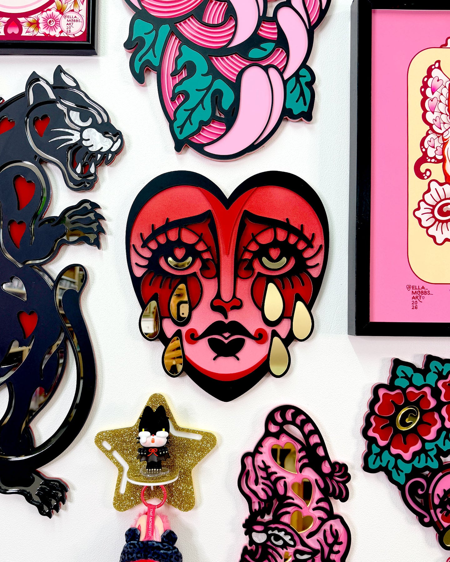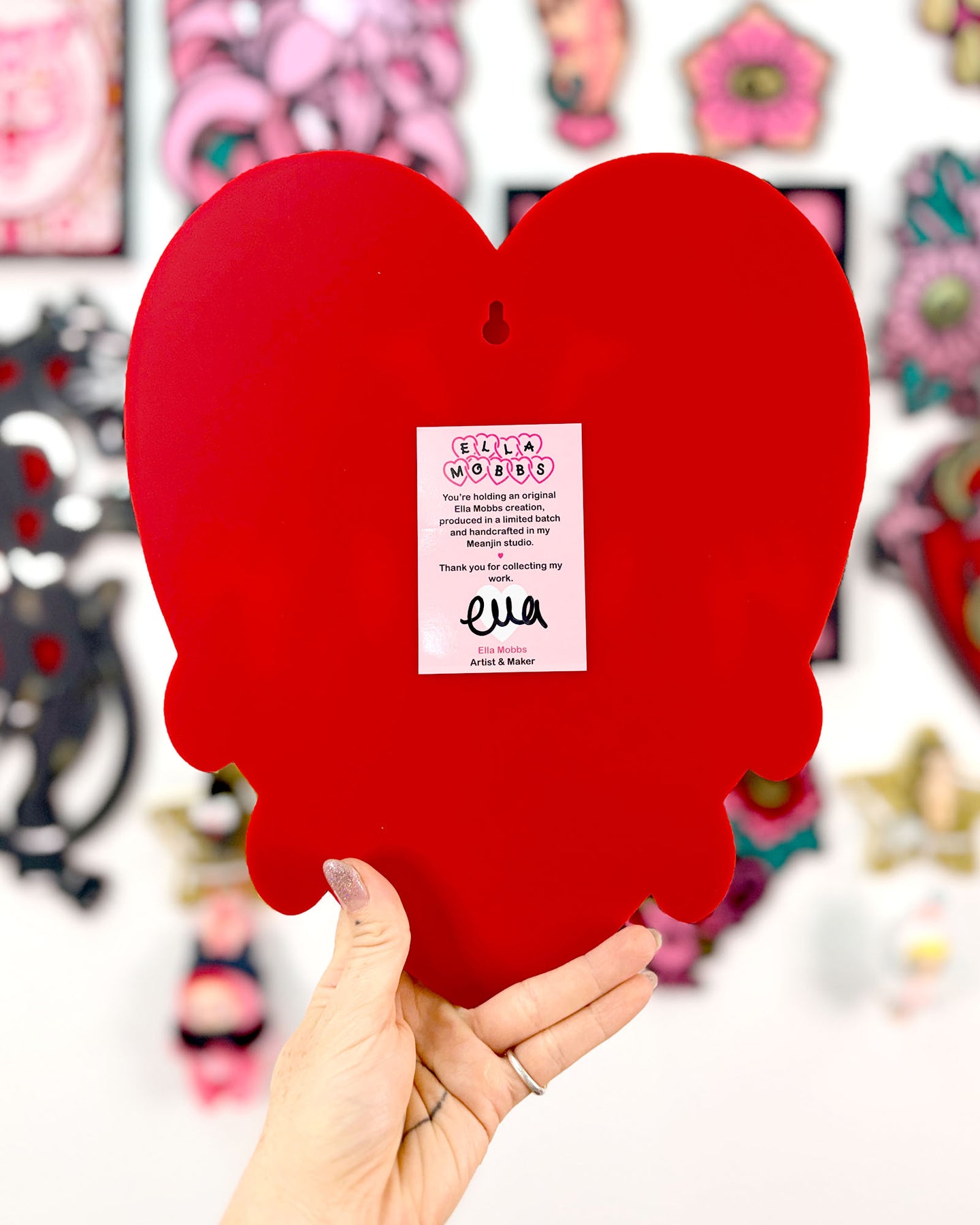 Handmade from quality laser-cut acrylic, illustrated and designed by Ella Mobbs. Carefully made and checked before shipping, with tiny natural variations that come with handmade art. Comes ready to hang (has an inbuilt hanger), is lightweight and easy to install, and adds cute personality to any space — a perfect gift for art lovers and collectors of cute things.